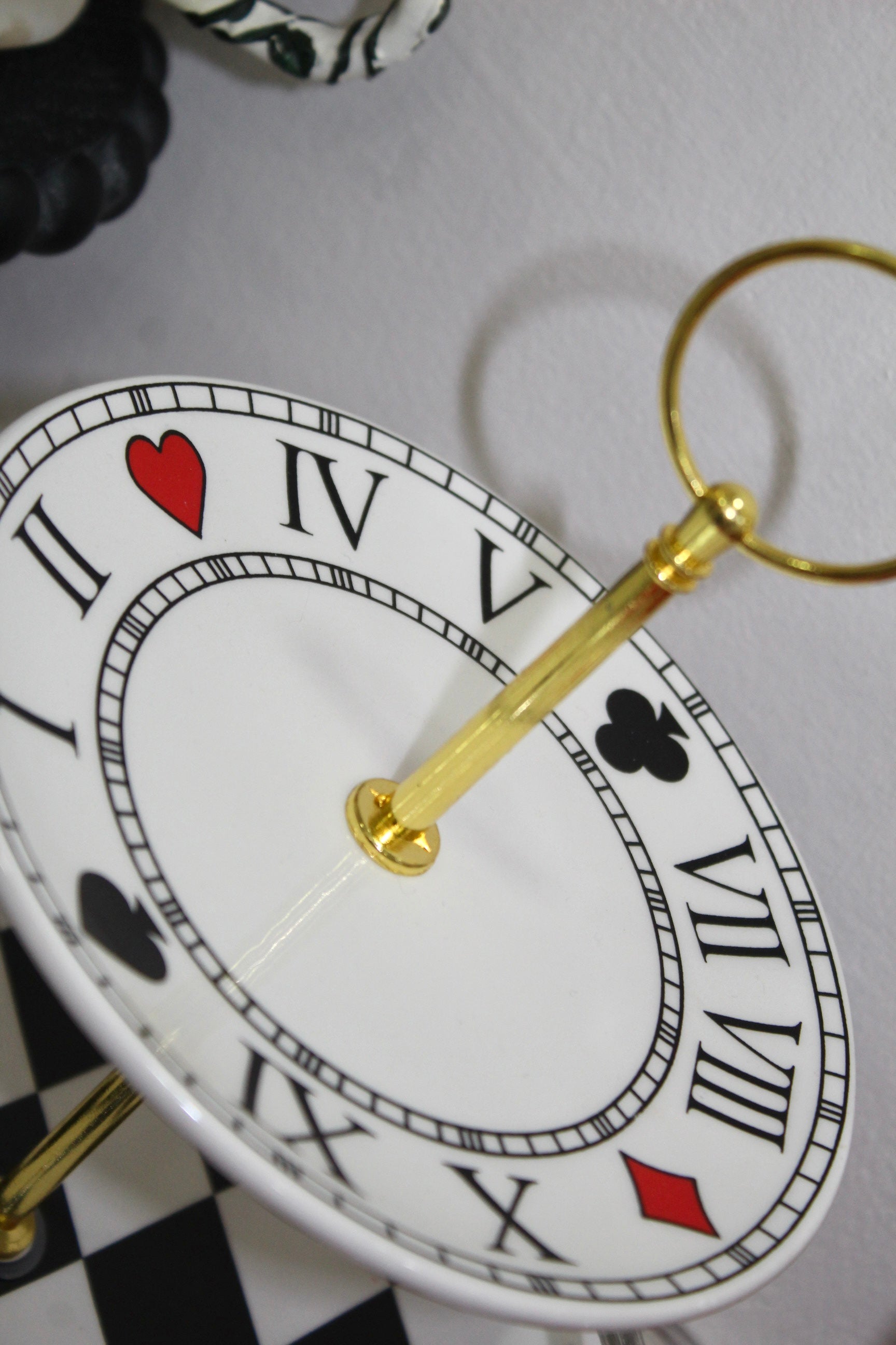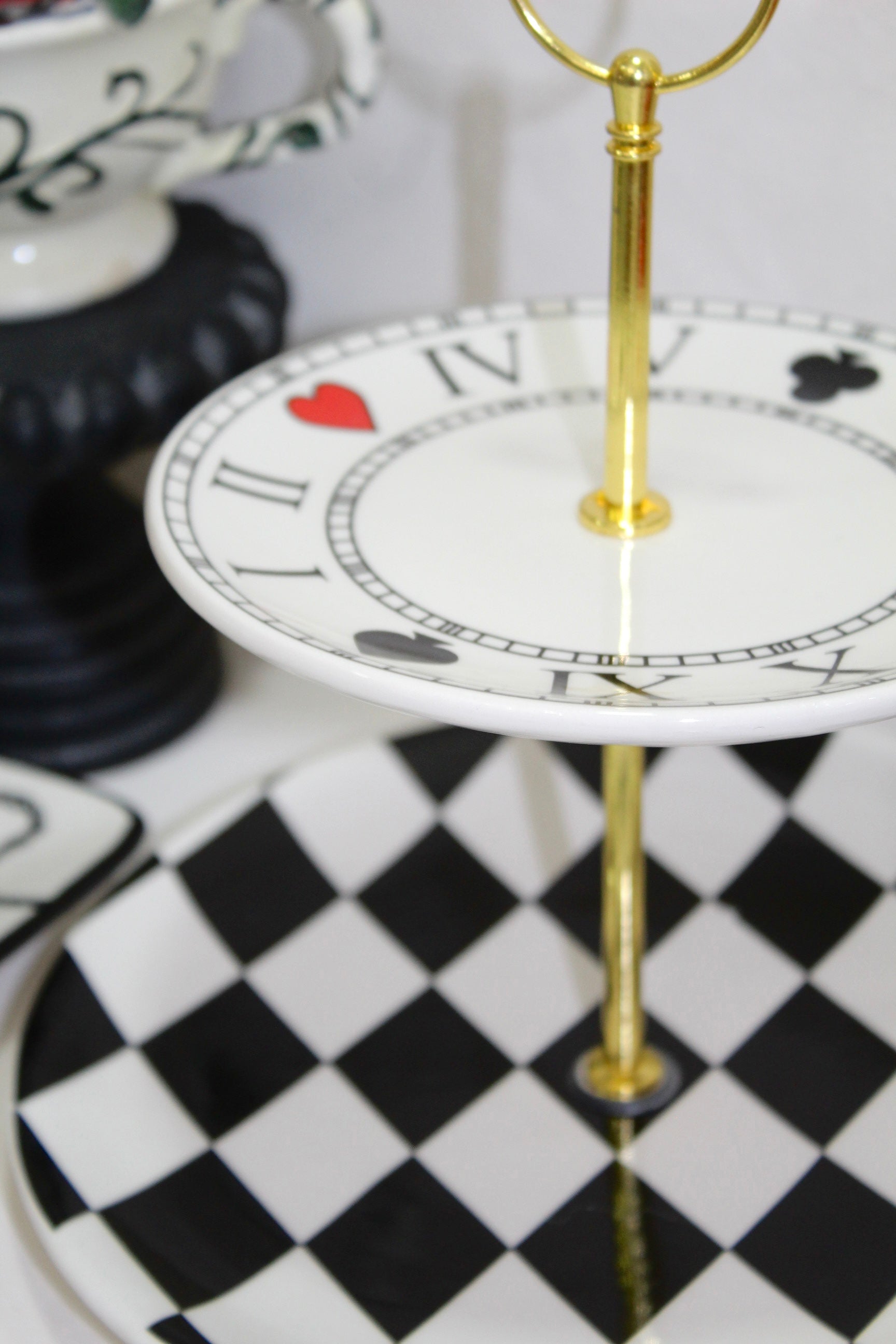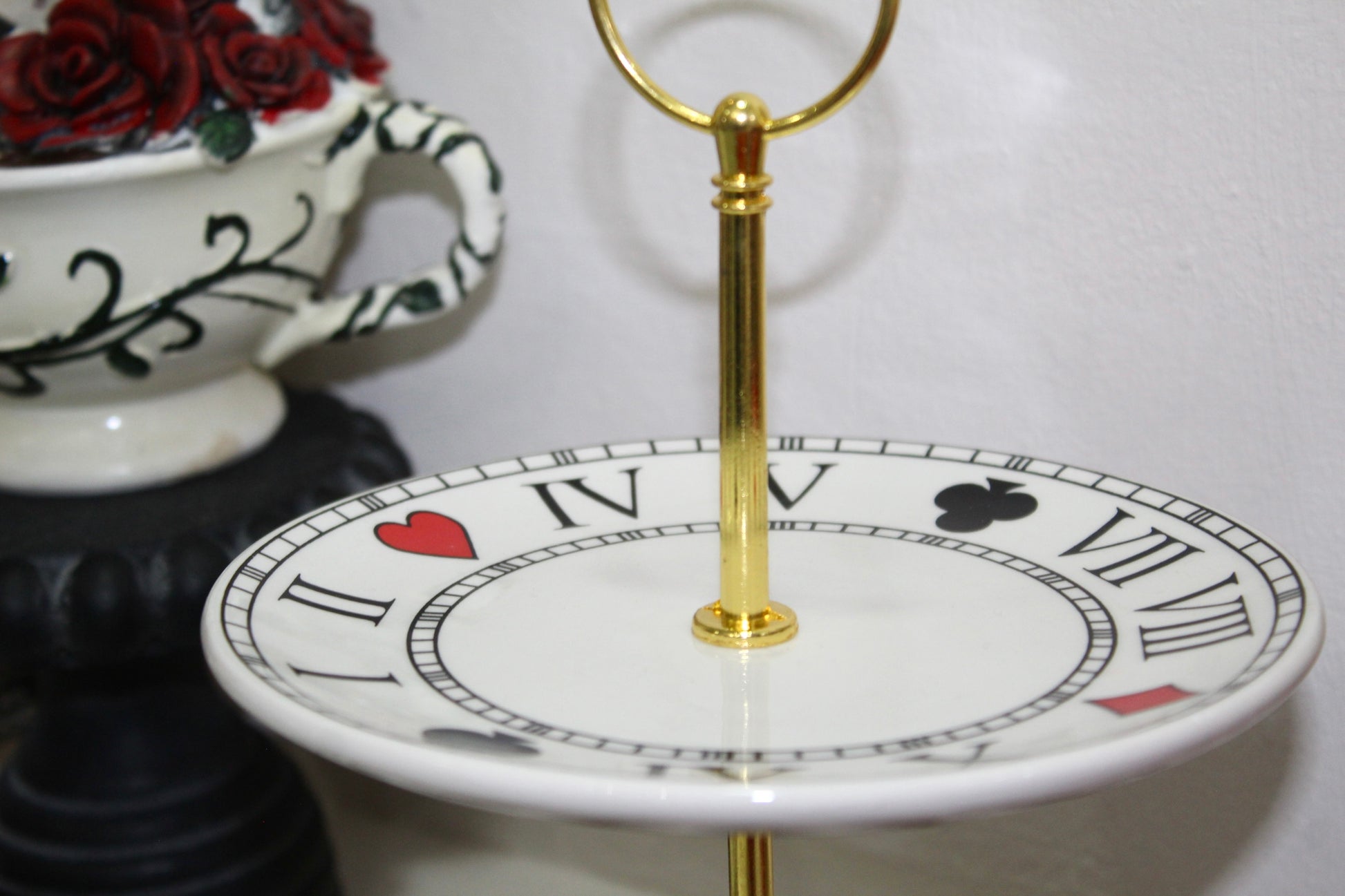 La bandeja de dos pisos inspirada en cuentos es perfecta para añadir un toque de encanto y elegancia a tu hogar. El piso superior cuenta con un diseño de esfera de reloj con números romanos y símbolos de naipes, mientras que el piso inferior tiene un patrón de tablero de ajedrez. El soporte central en color dorado asegura la estabilidad y la belleza de la bandeja. Haz que tus reuniones sean aún más especiales con esta pieza única.