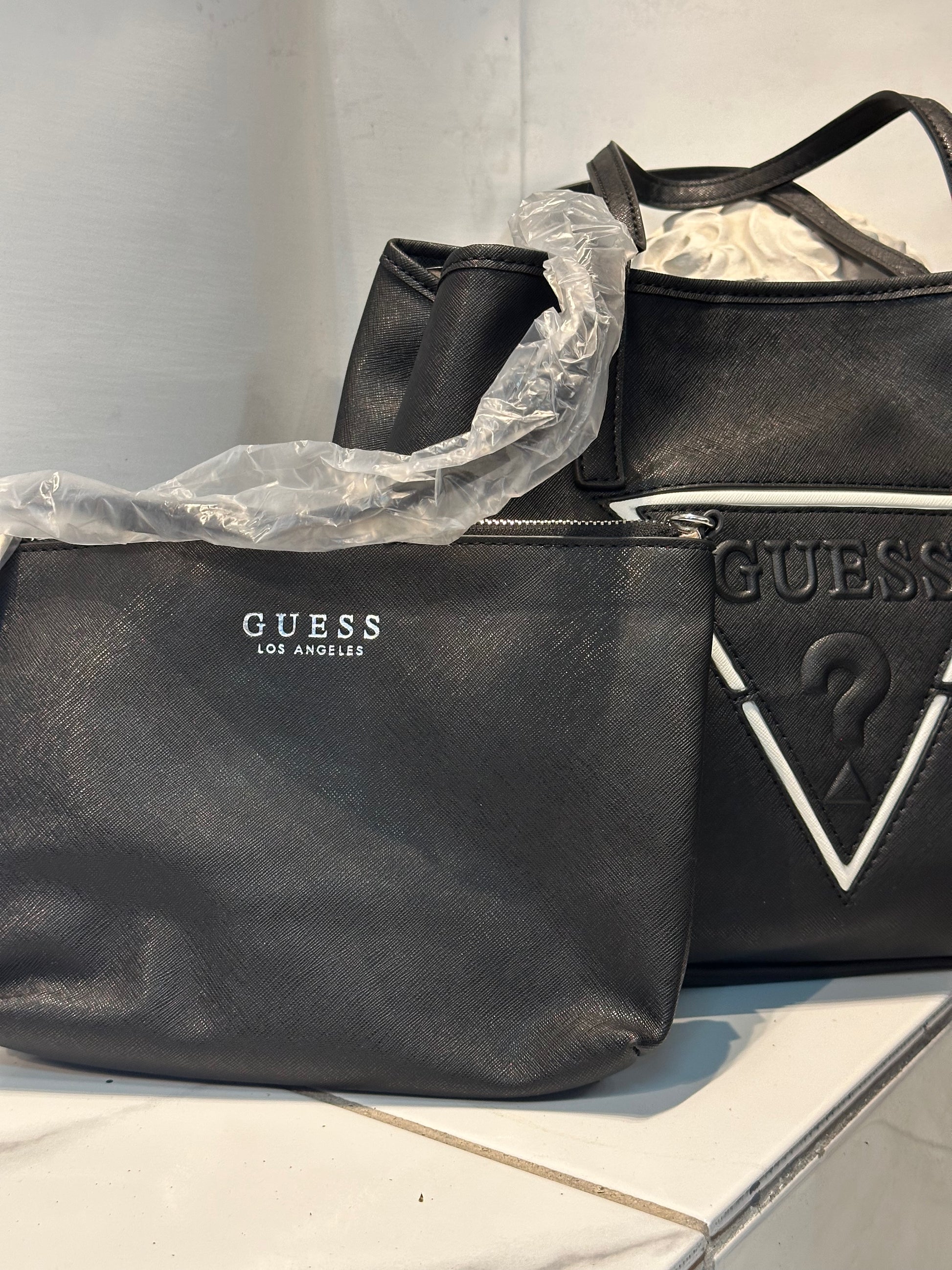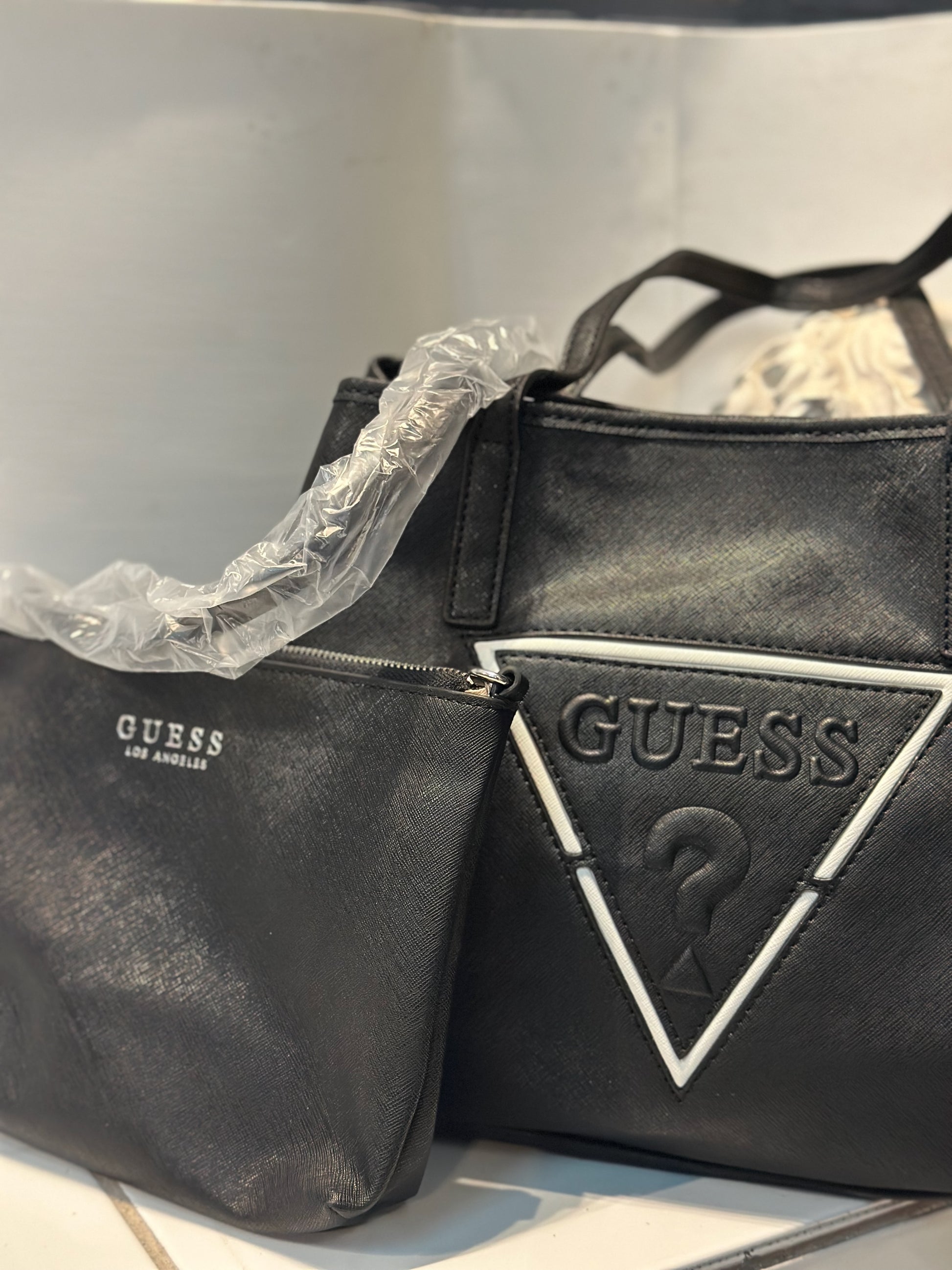 Es una bolsa tote con el logotipo triangular de Guess. Hecha en poliuretano de alta calidad y ofrece practicidad y estilo con gran espacio en su interior. Combinalo con todo.