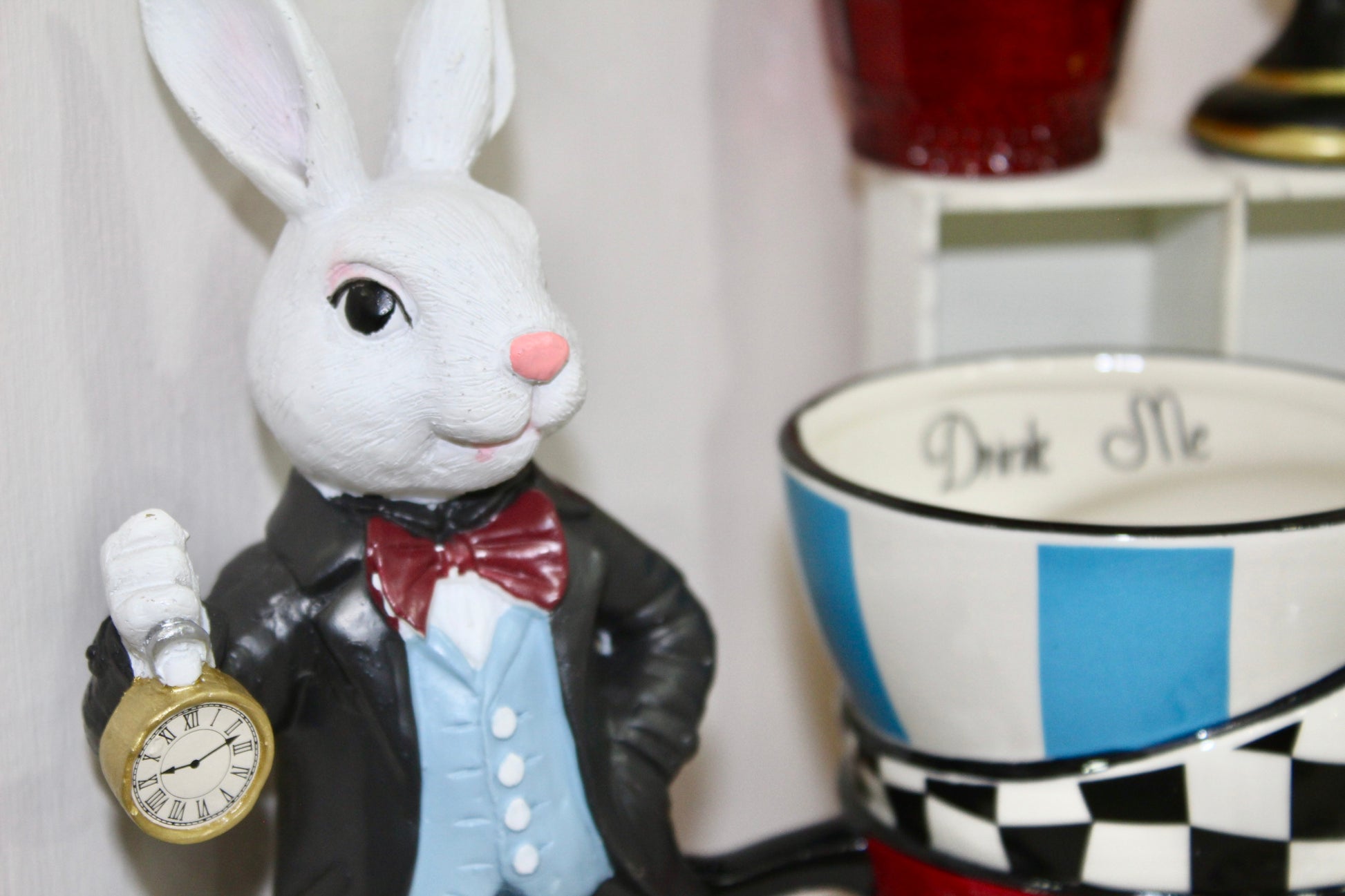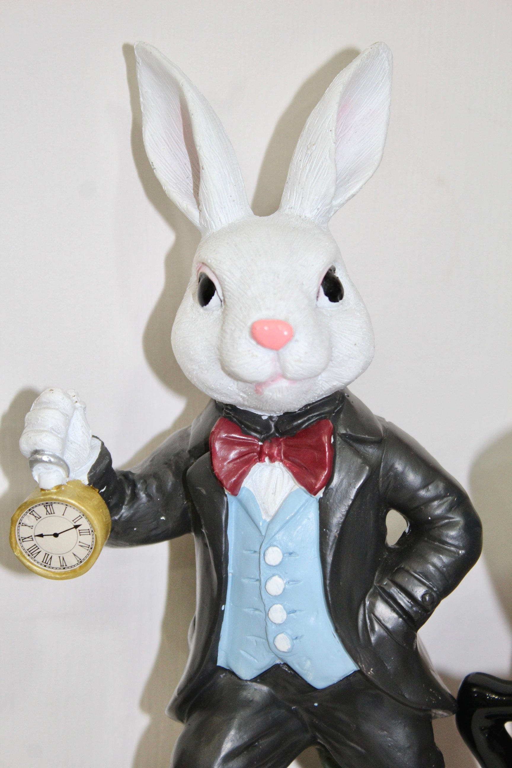 Esta figura decorativa del Conejo Blanco de Alicia en el País de las Maravillas es el perfecto elemento decorativo para coleccionistas o fanáticos de la historia. Con un traje detallado que incluye un saco oscuro, chaleco azul claro y corbata de moño roja, el conejo sostiene un reloj de bolsillo dorado en una de sus manos. Dé un toque de magia a su hogar con esta figura de alta calidad.