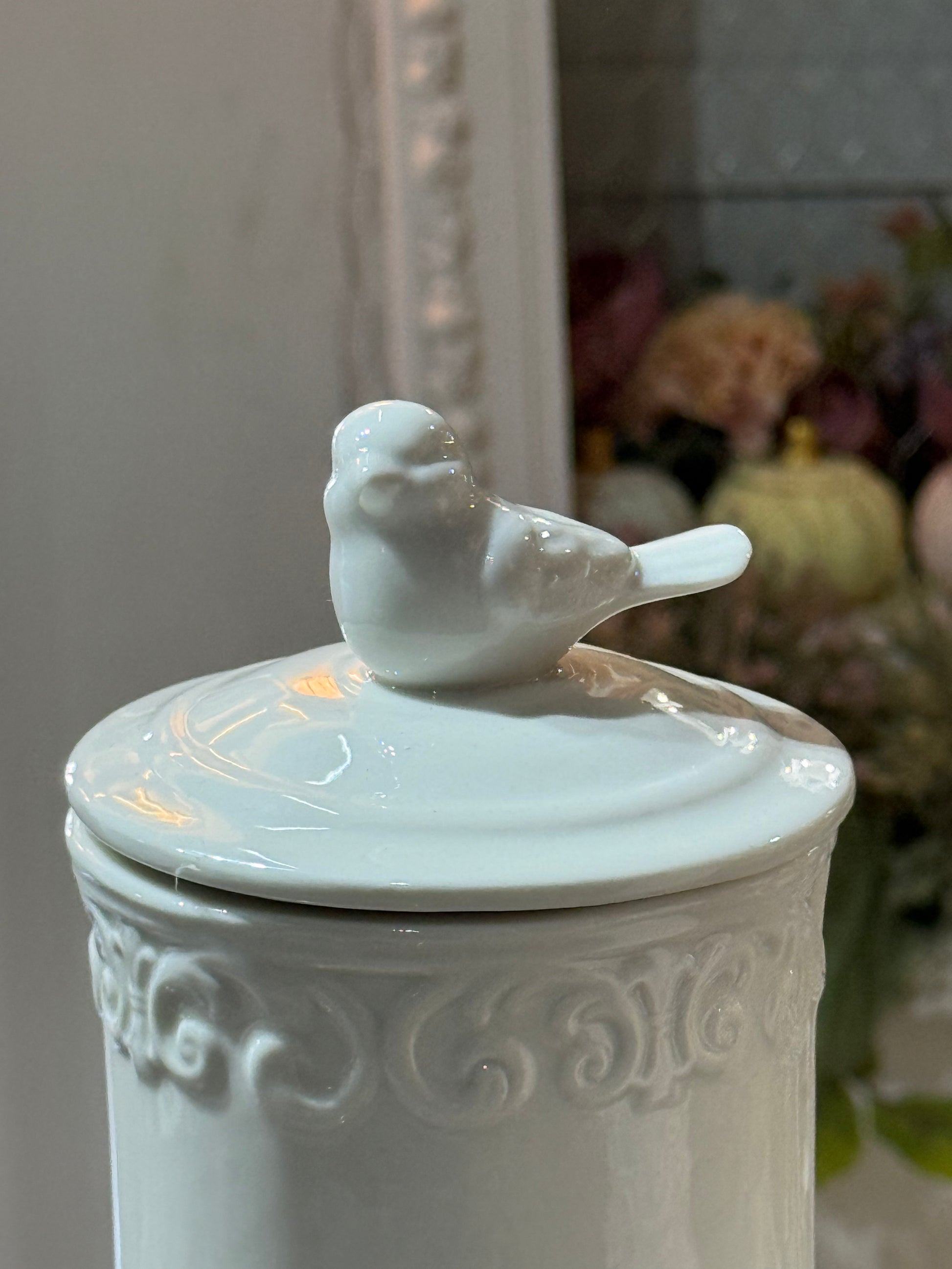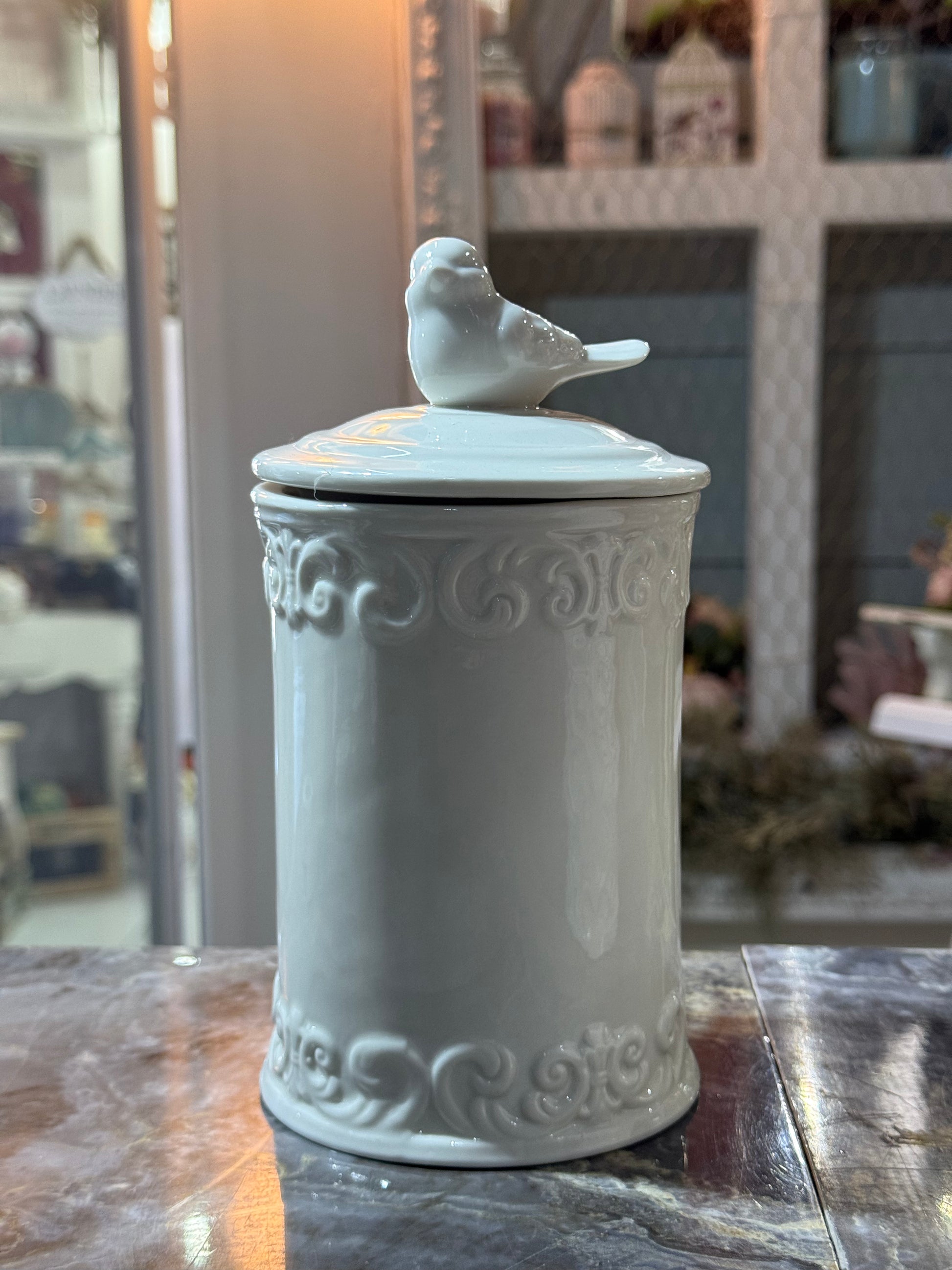 Este contenedor de cerámica presenta un lindo pajarito en la tapa. Perfecto para almacenar pequeñas joyas u objetos valiosos. Hecho de cerámica resistente para una durabilidad duradera.