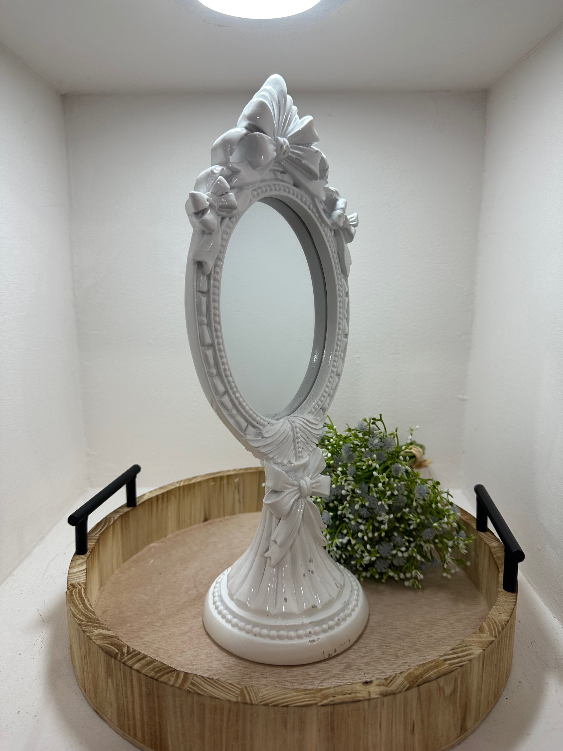 Este espejo vintage aporta un toque de elegancia y carácter a cualquier espacio. Su diseño clásico evoca nostalgia y sofisticación, convirtiéndolo en el complemento ideal para decorar paredes con estilo único. Además, su acabado detallado realza la decoración y crea un ambiente acogedor y lleno de encanto. Perfecto para quienes buscan combinar funcionalidad con un toque retro en su hogar.