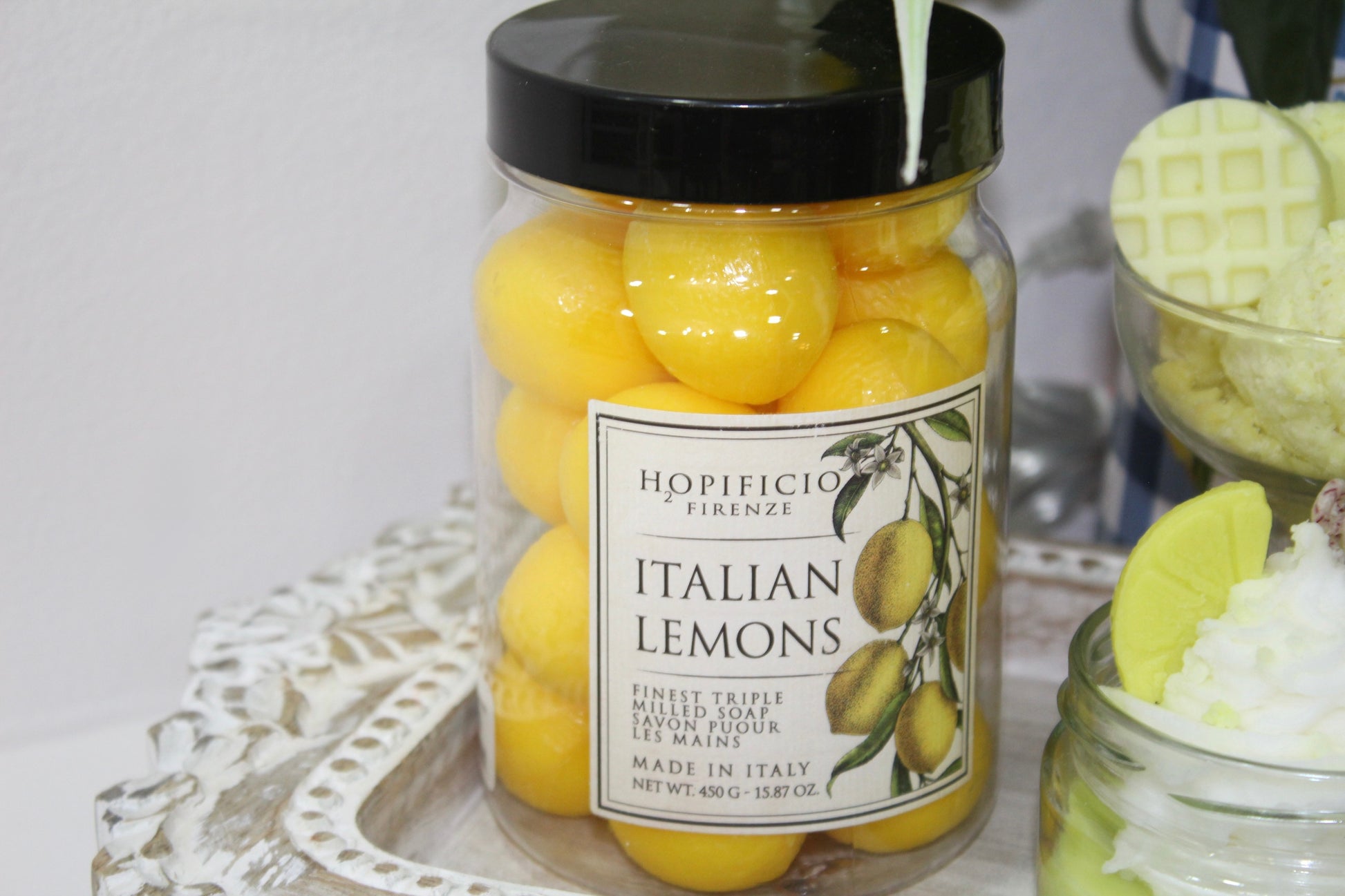 Este frasco contiene jabones decorativos con forma de limón, elaborados con materias primas naturales y esencias exclusivas. De triple molienda, su textura fina y espuma cremosa aseguran una limpieza y suavidad incomparables. Aromatizado con limón y adecuado para manos, cuerpo y cara, este jabón hidrata, energiza y deja la piel radiante. Fabricado en Italia. Peso neto: 450g (15.87oz).
