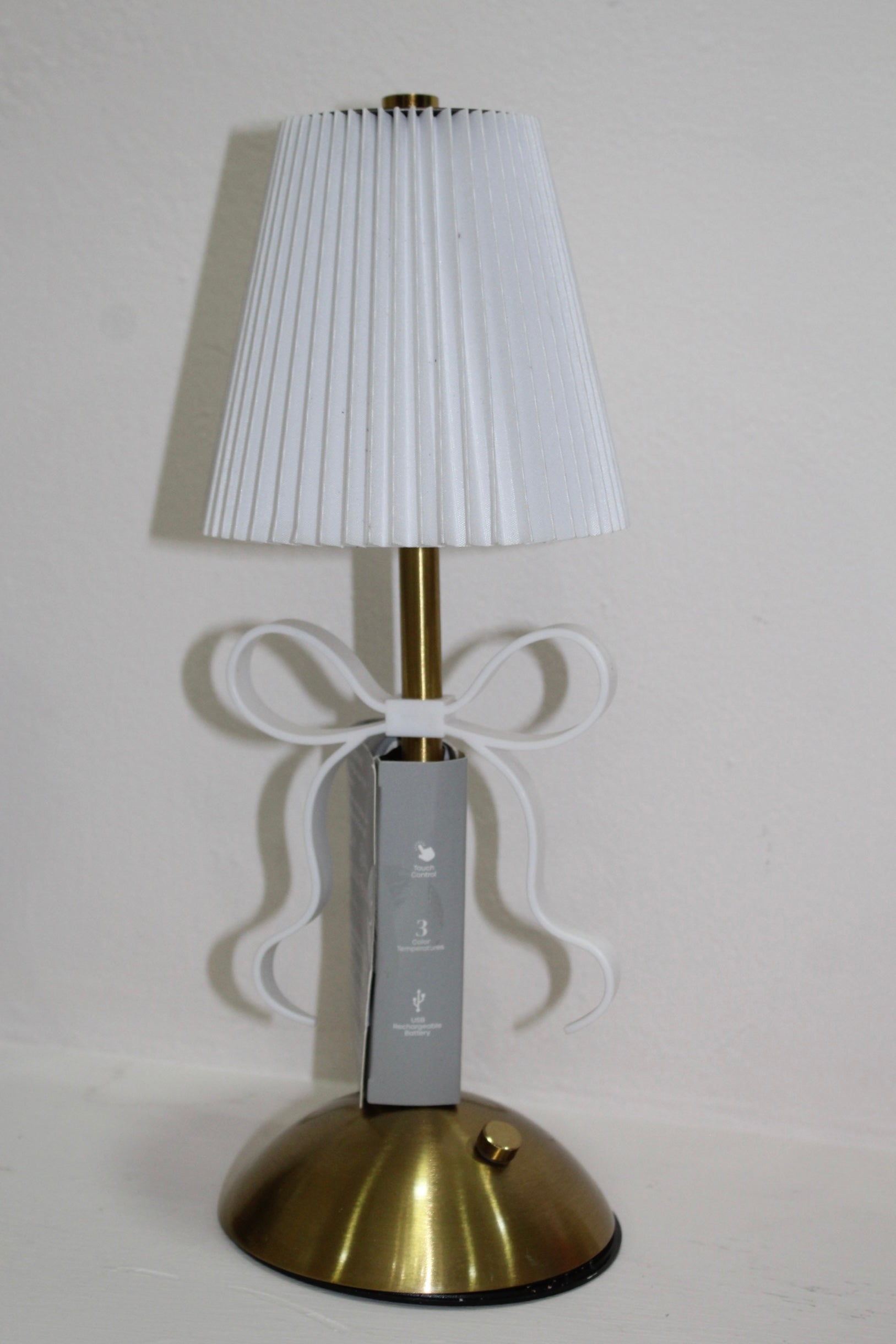 Esta lámpara de mesa es elegante y romántica gracias a su diseño distintivo. La pantalla plisada y el lazo blanco añaden un toque coqueto, mientras que la base y el tallo dorados crean un contraste cálido.