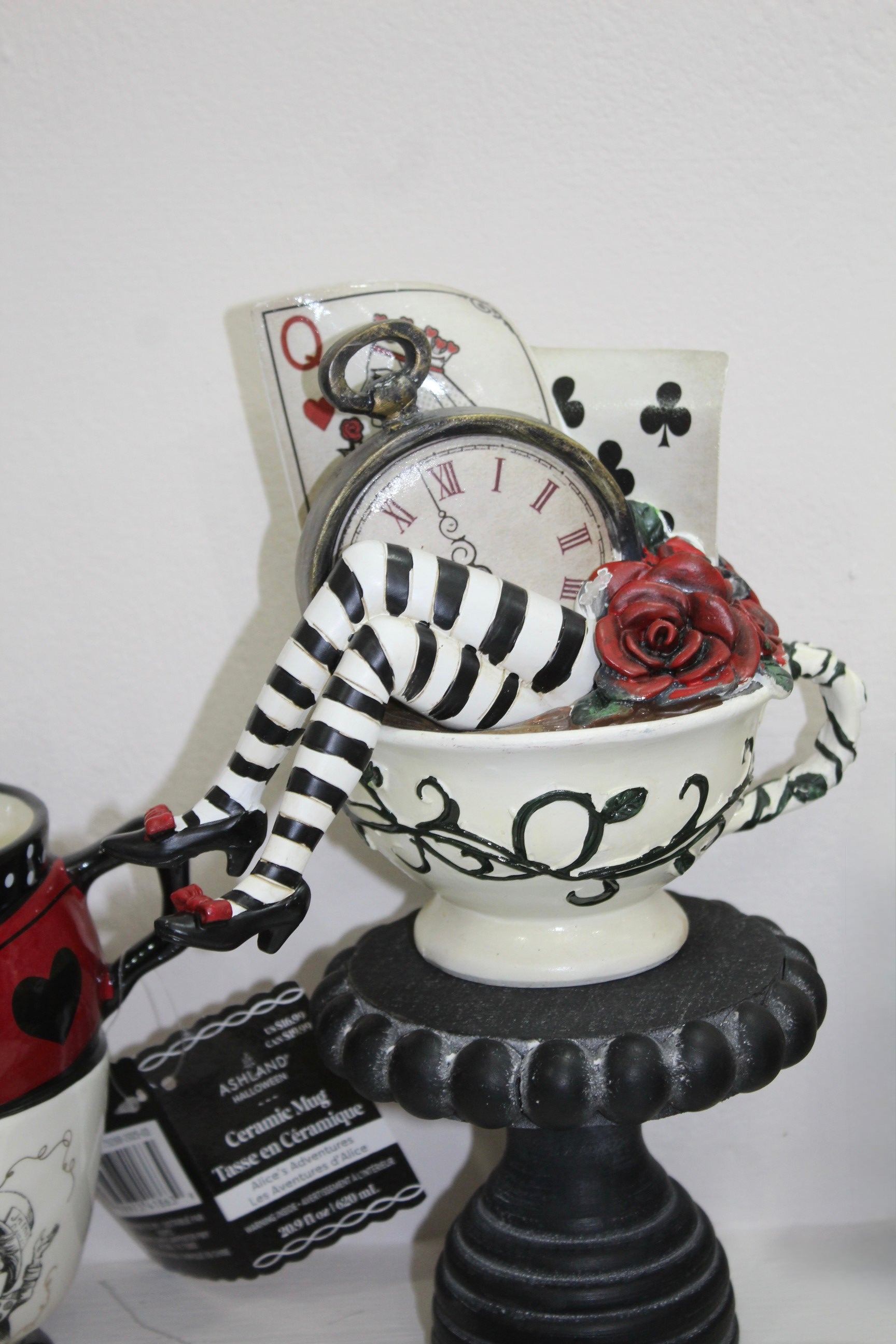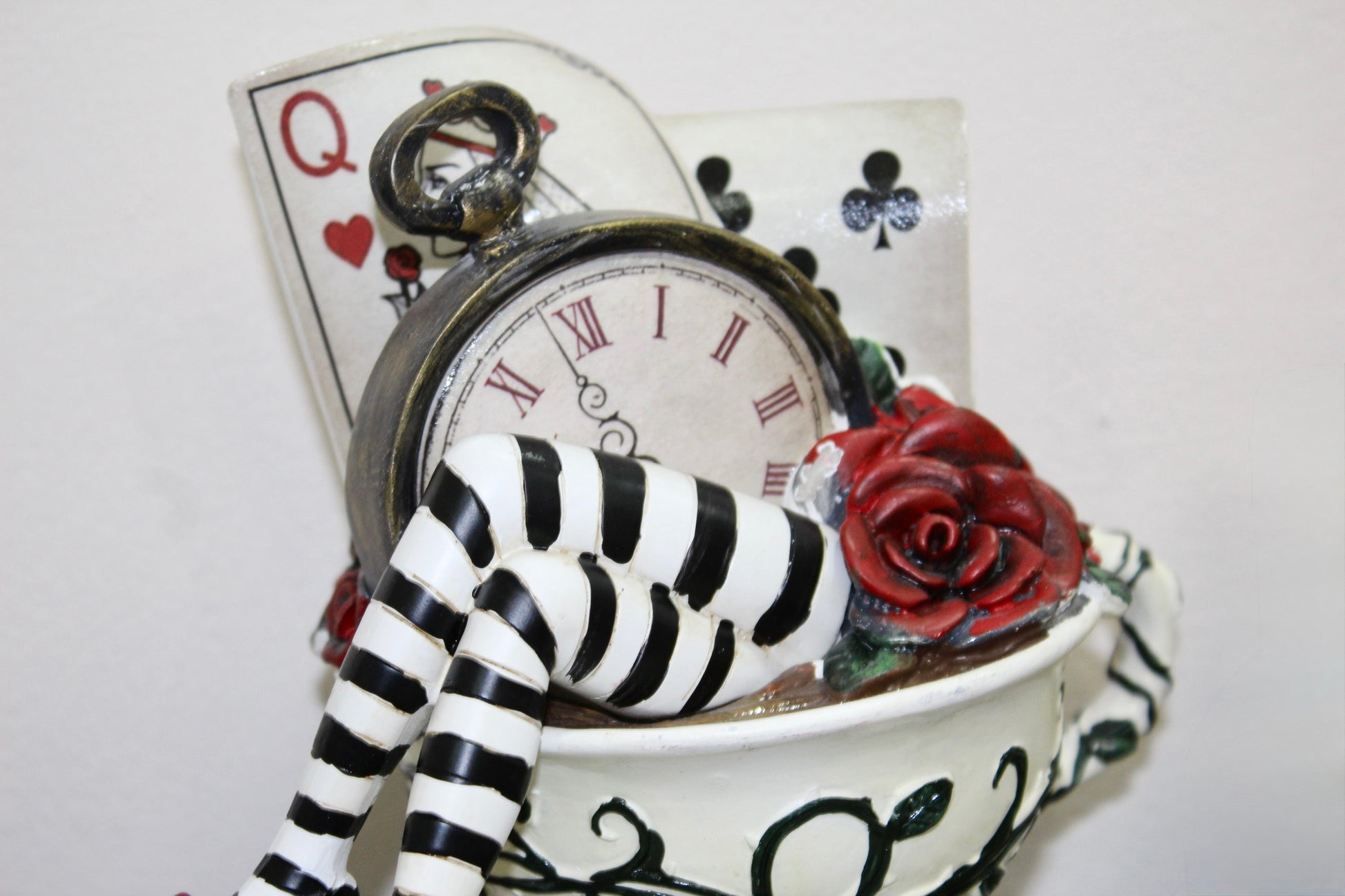 Esta pieza decorativa de "Alicia en el País de las Maravillas" es una taza de té de estilo vintage con detalles ornamentales en negro. Dentro de la taza, se encuentran elementos icónicos de la historia como las piernas de Alicia, una rosa roja, un reloj de bolsillo y cartas de póker. Un toque de fantasía para cualquier espacio.