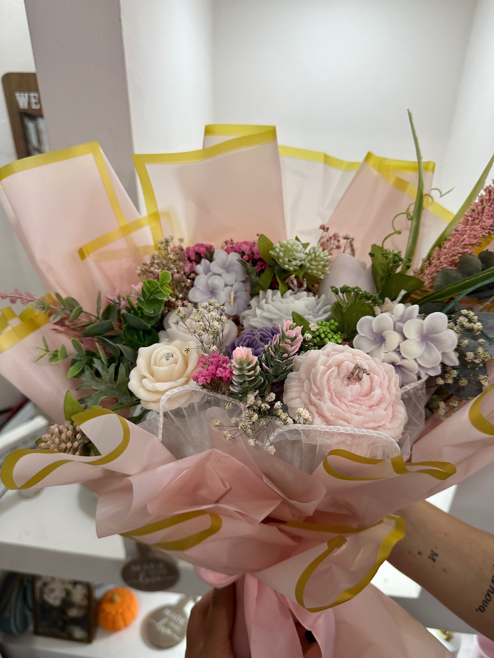 Descubre la elegancia y calidez de nuestro ramo de velas, hecho a mano con cera de soya natural. Cada vela desprende un aroma exquisito que transforma cualquier espacio, creando un ambiente acogedor y sofisticado. Perfecto para regalar o para darle un toque especial a tu hogar con un detalle único y sostenible.