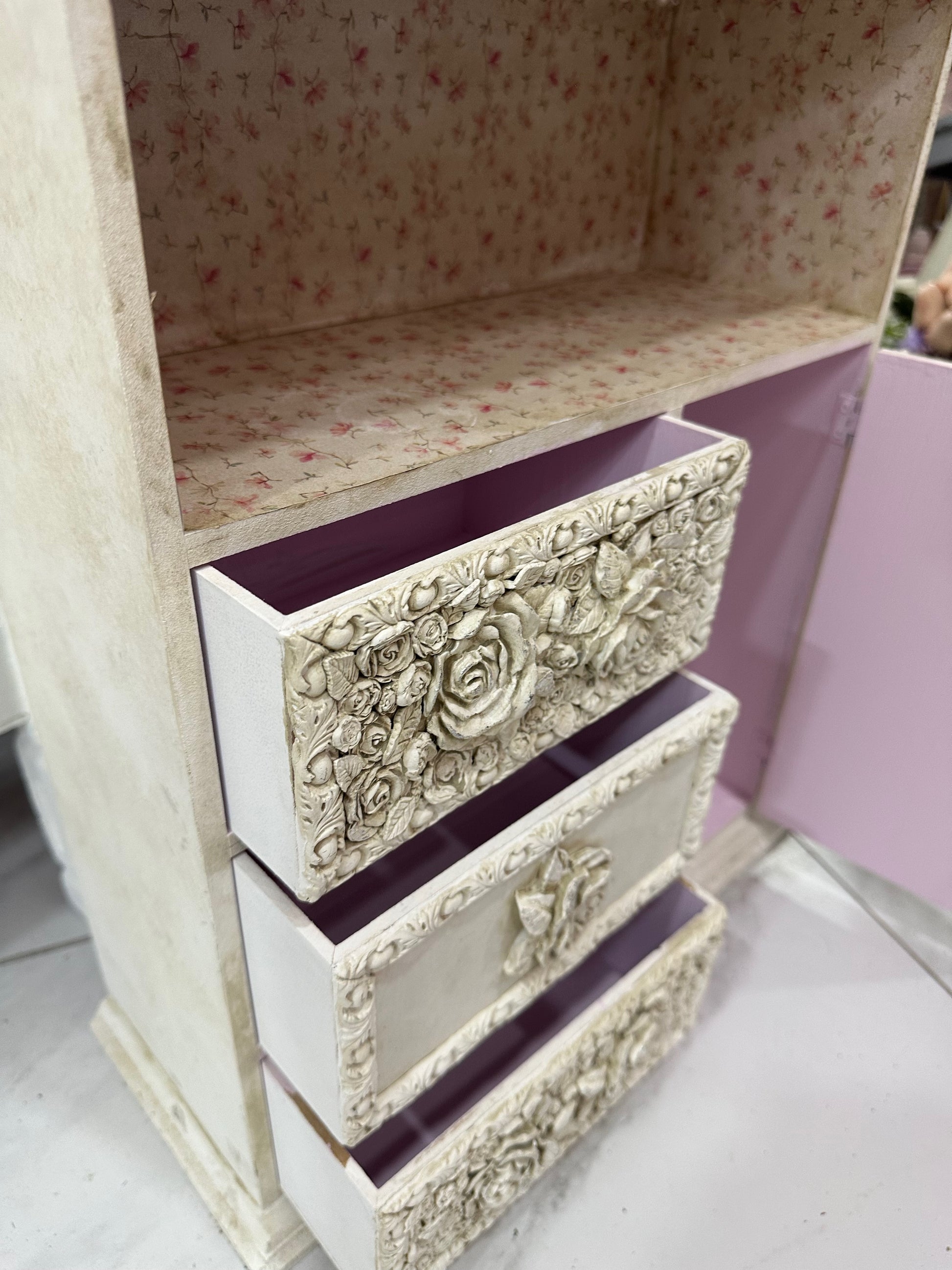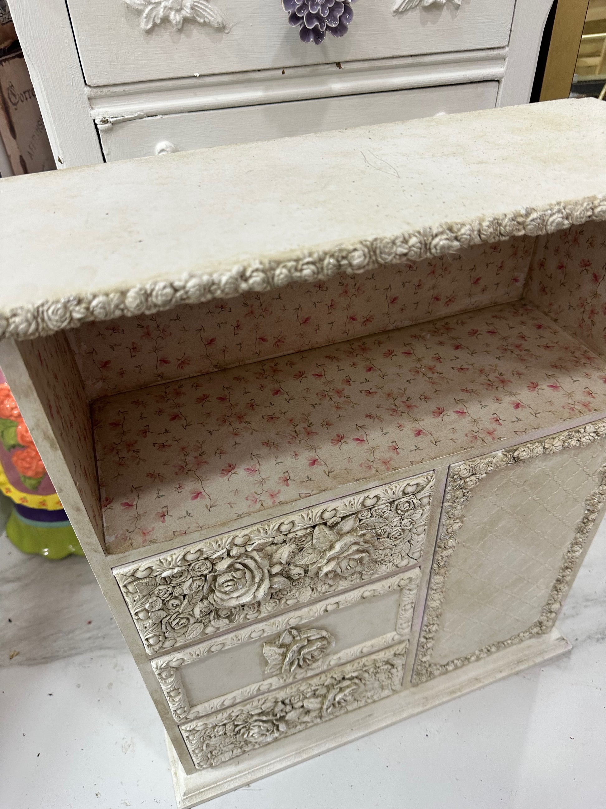 Este mueble vintage con cajonera pequeño es perfecto para espacios reducidos. Su diseño que simula un ropero aporta un toque encantador y funcional, ideal para decorar y organizar sin ocupar mucho lugar. Aprovecha su tamaño compacto para transformar cualquier rincón en un área con estilo y orden.